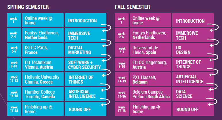Together with four international partner universities, Fontys School of ICT developed a minor programme of one semester (30 ECTS). The participating universities are located in: Spain, Austria, Belgium, South-Africa, and The Netherlands of course (Fall semester) and Austria, Greece (Crete) and Canada (Spring semester).